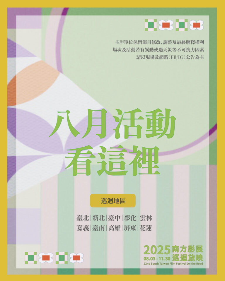 2025南方影展巡迴8月場次表2025首頁 / 2025南方影展 / 總場次表 Screening Schedule 2025影展巡迴8月場次表 影片介紹處皆有預告片,歡迎瞭解更多 本場次表所標註片長不含影人座談時間 每場次映後座…